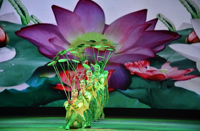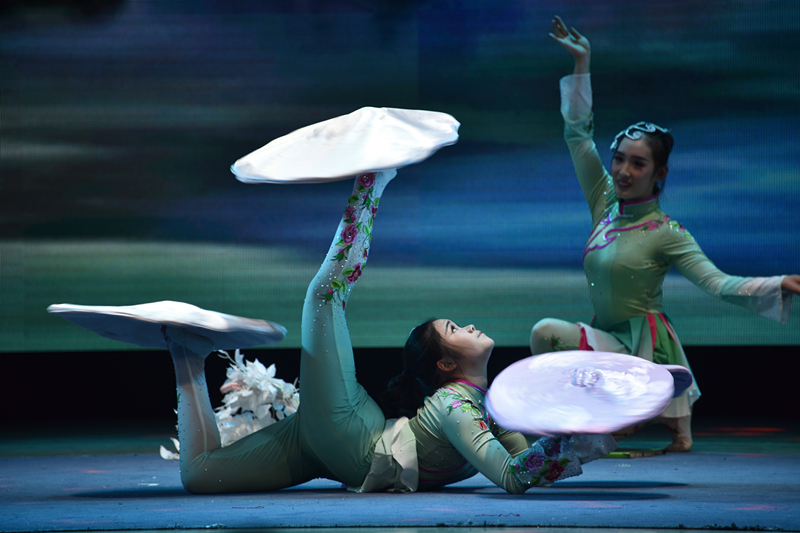 雜技《荷韻--轉碟》曾榮獲全國雜技大賽優(yōu)秀節(jié)目獎,演員們用一根長約一米,粗如鉛筆的竿子頂著碟底,晃動旋轉,看上去似迎風而立的荷花,又若飛舞的彩蝶,優(yōu)美而抒情。