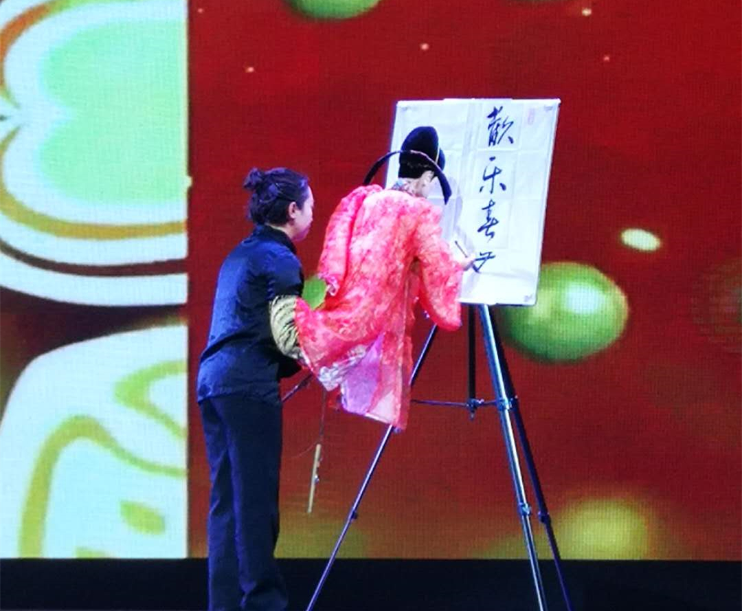 國家級非遺項目江蘇揚州杖頭木偶劇與其他非遺項目結合,創(chuàng)作了木偶劇《變臉》、《書法》。川劇中的“變臉”絕活,移植到木偶上,讓“木偶”代替“活人”進行“絕活”展示,難度可想而知。書法是古代文明文化的象征,木偶書法更是罕見,難度極高,且為左手握筆,對木偶的操作技巧以及操縱者的書畫功底有極高要求。