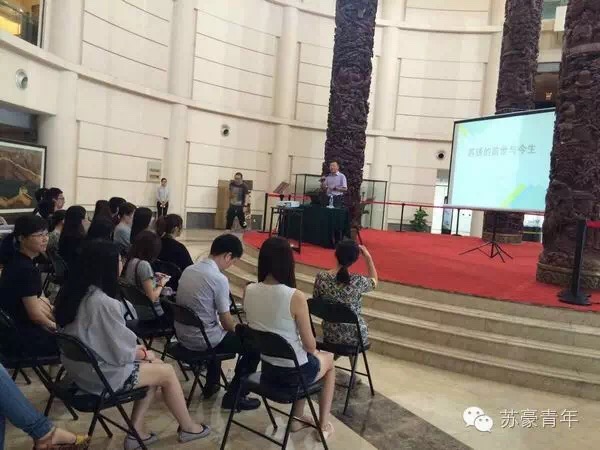 參觀完館藏珍品后,愛濤文化產(chǎn)業(yè)公司總經(jīng)理助理、研究員級高級工藝美術(shù)師呂元先生為大家做了一場題為《蘇繡的前世與今生》的藝術(shù)講座。講座在宏偉的木雕巨作“四大名柱”下開講,呂元先生旁征博引,從中華民族的起源講起,系統(tǒng)而細(xì)致地將蘇繡這一民族傳統(tǒng)工藝的前世今生講得精彩透徹,獲得了青年同事們的一致好評。