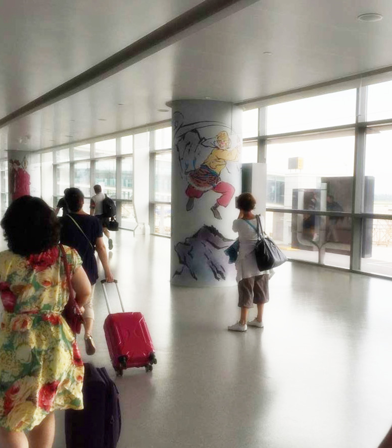 下了飛機(jī)疲憊的倦容適合欣賞一些美景,隨著輕輕的步調(diào),環(huán)顧四周,灰白色的墻上已換上新裝,沒有半點(diǎn)亂花漸欲迷人眼的浮躁感,不驕不躁的水墨情呈現(xiàn)給燈箱是再合適不過的,整個(gè)T2航站樓的長廊儼然開拓了一副新天地,斜陽西照,深色的柱子上一幅幅西游記的經(jīng)典場景回放著映入眼簾,穿過獨(dú)具特色的長廊,陽光透過玻璃墻,照射在灰色的地面上。恢弘大氣的長廊里,有一種內(nèi)斂含蓄的文化底蘊(yùn)在涌動(dòng),長廊如紙,柱體如虹,旅客的性情、思緒,融入在造型、筆墨、意蘊(yùn)之中,整個(gè)長廊里流動(dòng)著平實(shí)敦厚,溫潤超逸的謙謙之音,旅客亦喜焉,似樂也。