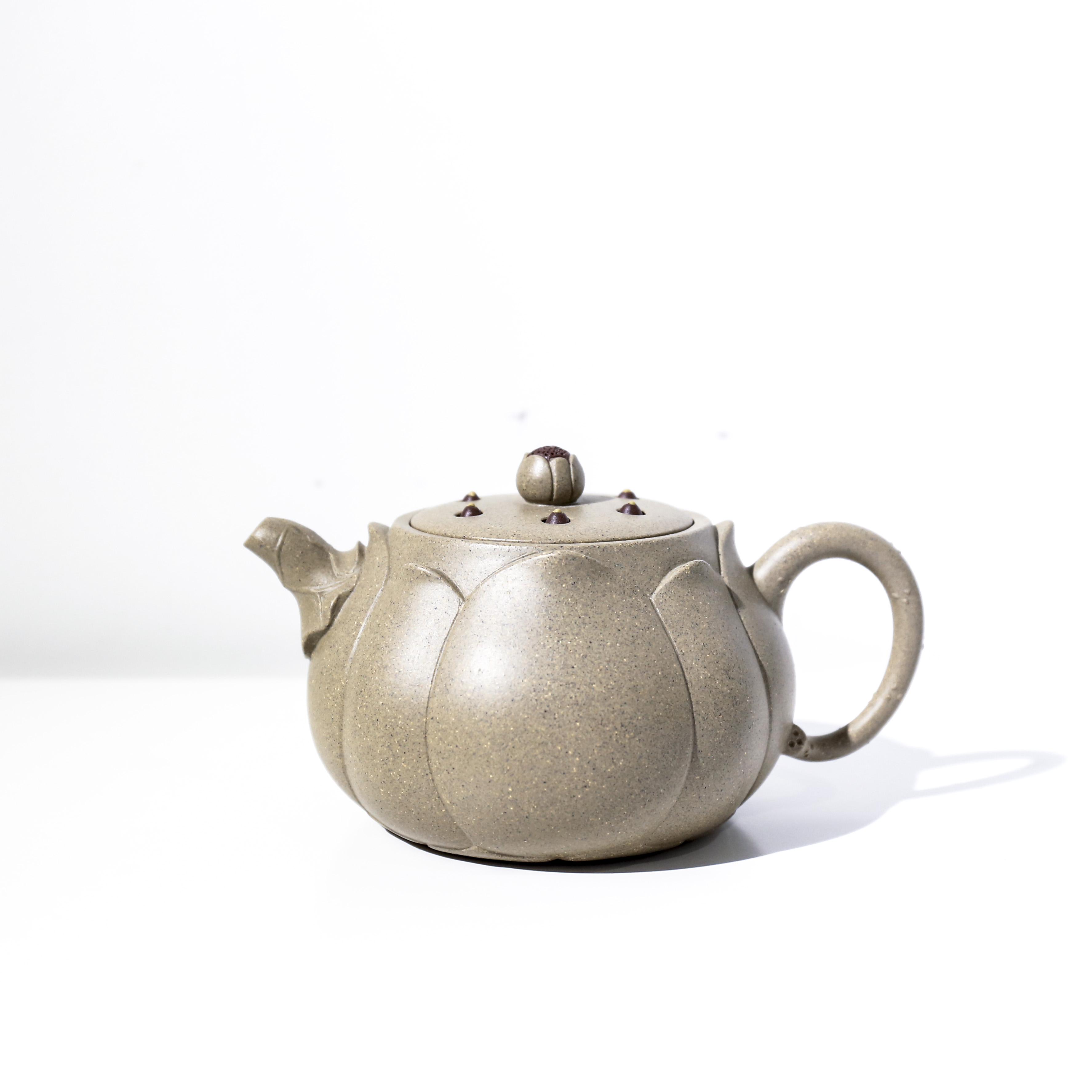 《蓮心壺》是宜興紫砂陶的花器造型精品。《蓮心壺》以一朵含苞欲放的荷花作壺身,卷裹的荷葉為壺嘴,以四周長滿濃濃毛刺的荷花枝梗挽成壺把,荷花的花瓣,荷葉的經(jīng)脈都流暢自然。上方以蓮蓬作壺蓋,壺蓋上含苞欲放的花蕾為壺鈕,此壺整體造型比例協(xié)調(diào)、勻稱,線條流暢、優(yōu)美,體現(xiàn)了濃烈的生活情趣。