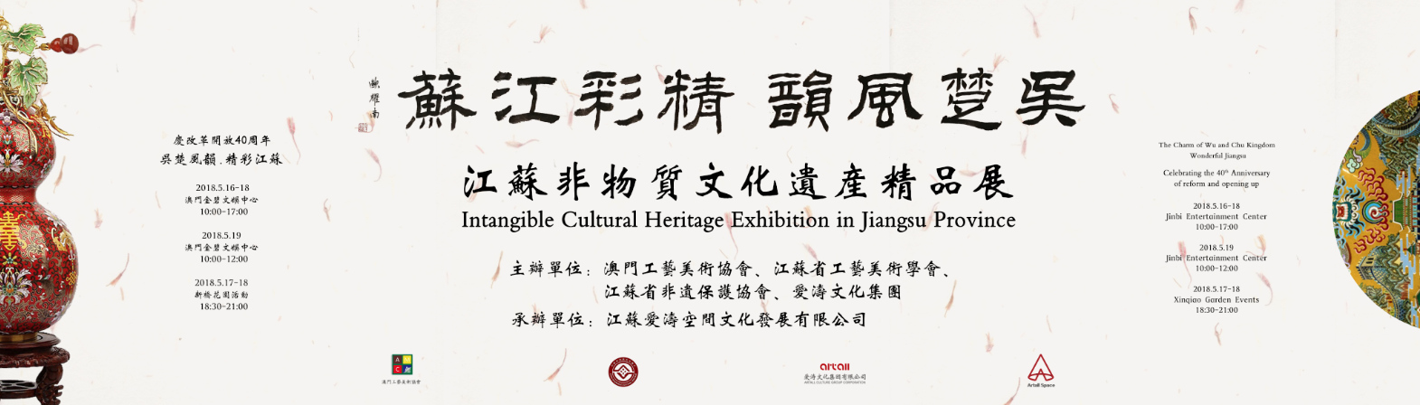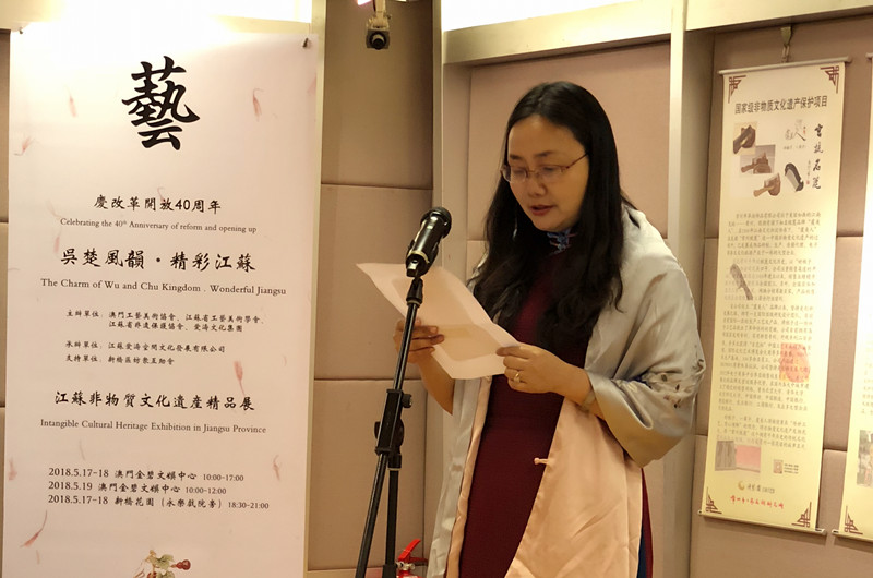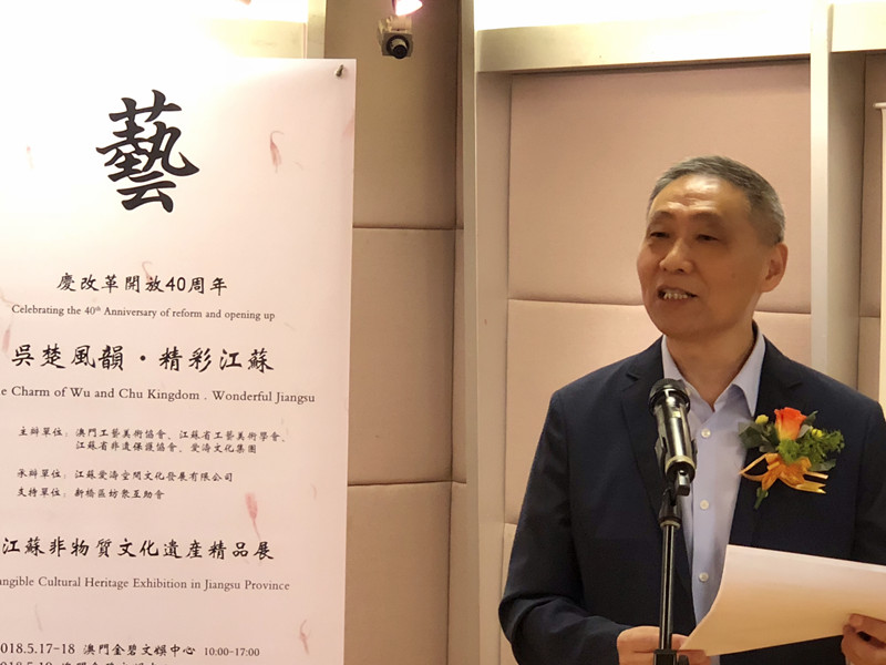 由澳門工藝美術(shù)協(xié)會、江蘇省工藝美術(shù)學(xué)會、江蘇省非遺保護(hù)協(xié)會、愛濤文化集團(tuán)聯(lián)合主辦,江蘇愛濤空間文化發(fā)展有限公司承辦,澳門新橋區(qū)坊眾互助會協(xié)辦的文化部2018年內(nèi)地與港澳文化交流重點(diǎn)項(xiàng)目“慶改革開放40周年吳楚風(fēng)韻.精彩江蘇澳門行--江蘇省非物質(zhì)文化遺產(chǎn)精品展”,5月16日至19日在澳門舉行。